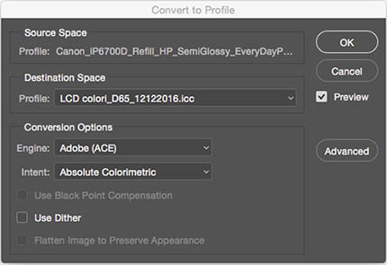 La soluzione è una seconda conversione: dal profilo colore della stampante al profilo del monitor, utilizzando l’intento di rendering colorimetrico assoluto.